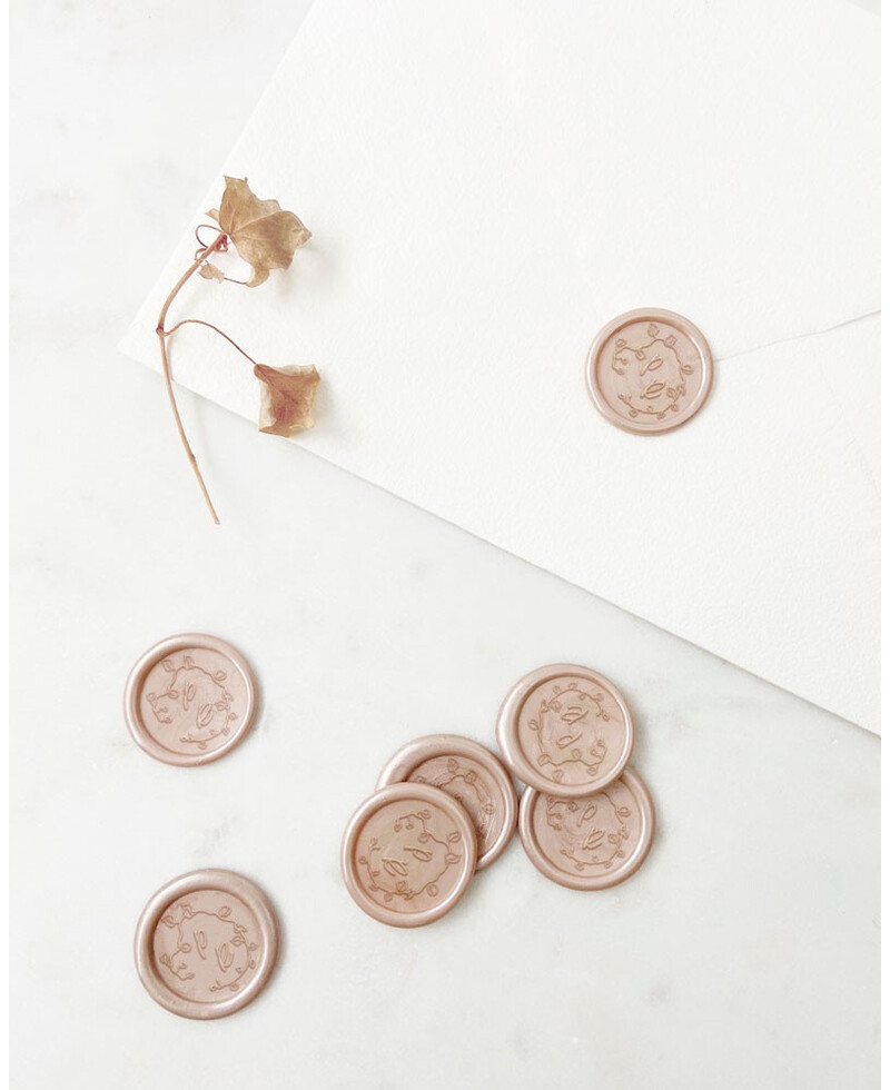 Personalisiertes Siegel mit den Initialen des Brautpaares, begleitet von einer Liane. Ein zartes und romantisches Wachssiegel, das Hochzeitseinladungen, Umschlägen, Briefpapier und anderen Accessoires oder Dekorationen eine elegante Note verleiht.