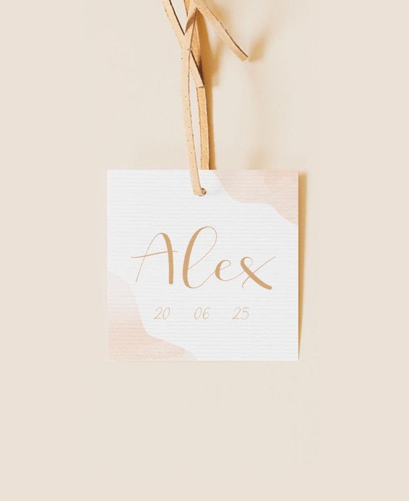 Etiqueta para bautizo cuadrada, decorada con elegantes pinceladas de acuarela en tonos nude y una delicada mezcla tipográfica. La papelería infantil perfecta para la celebración del bautismo de tu bebé.