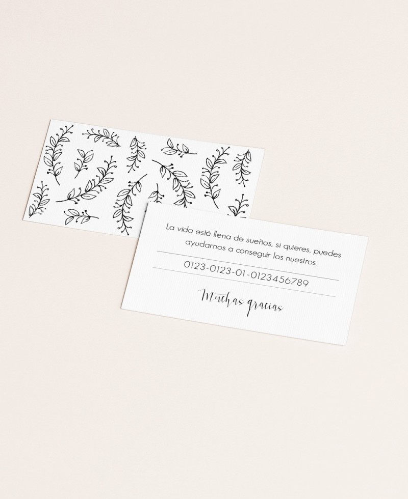 ¿Cómo comunicar tu lista de boda o número de cuenta de manera elegante? Nuestras tarjetas de lista de bodas están creadas para hacerlo con estilo y simplicidad. Compleméntalas con el resto de la colección a juego para asegurar una celebración refinada y coherente. ¡La opción perfecta para una comunicación sutil y efectiva!