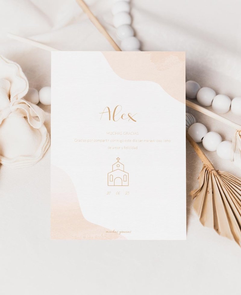 Rappel du baptême. Gratitude minimaliste pour les enfants, avec d’élégants coups de pinceau à l’aquarelle dans des tons nude. Décoré d’une église et d’une croix dans un style classique. Parfait pour que vos proches gardent un détail de cette journée spéciale.