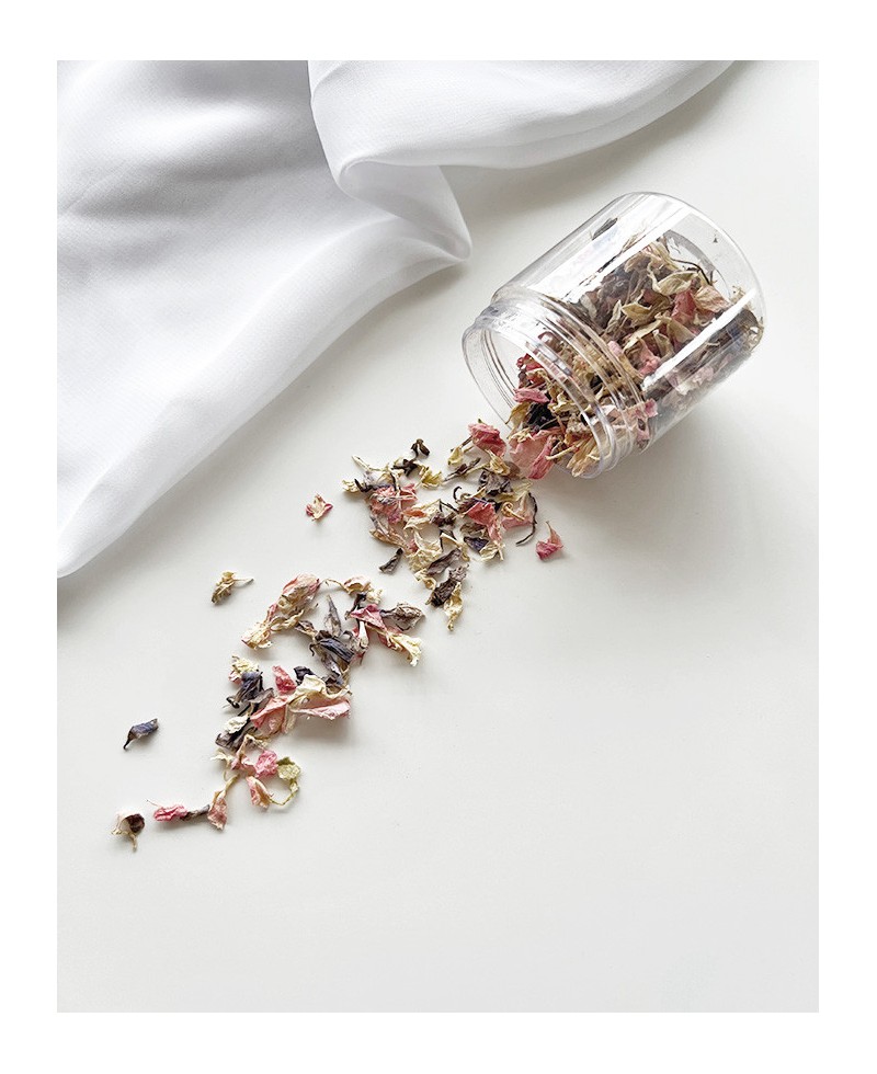 Jar with a unique selection of dried petals in lilac, pink and ivory tones to adorn your wax seals.