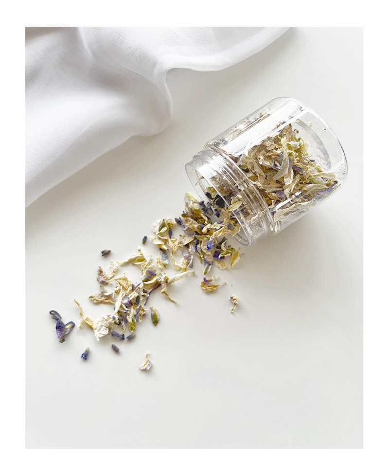 Jar with a unique selection of dried petals in powdery blue and ivory tones to adorn your wax seals.
