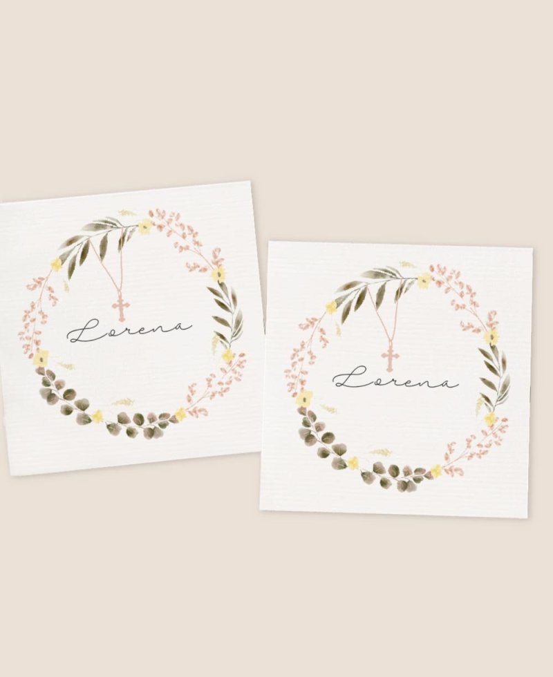 Adesivo quadrato per la comunione decorato con un acquerello floreale e una collana con una croce nei toni naturali. I dettagli della cancelleria per il giorno della festa di cui tu e il tuo piccolo vi innamorerete .