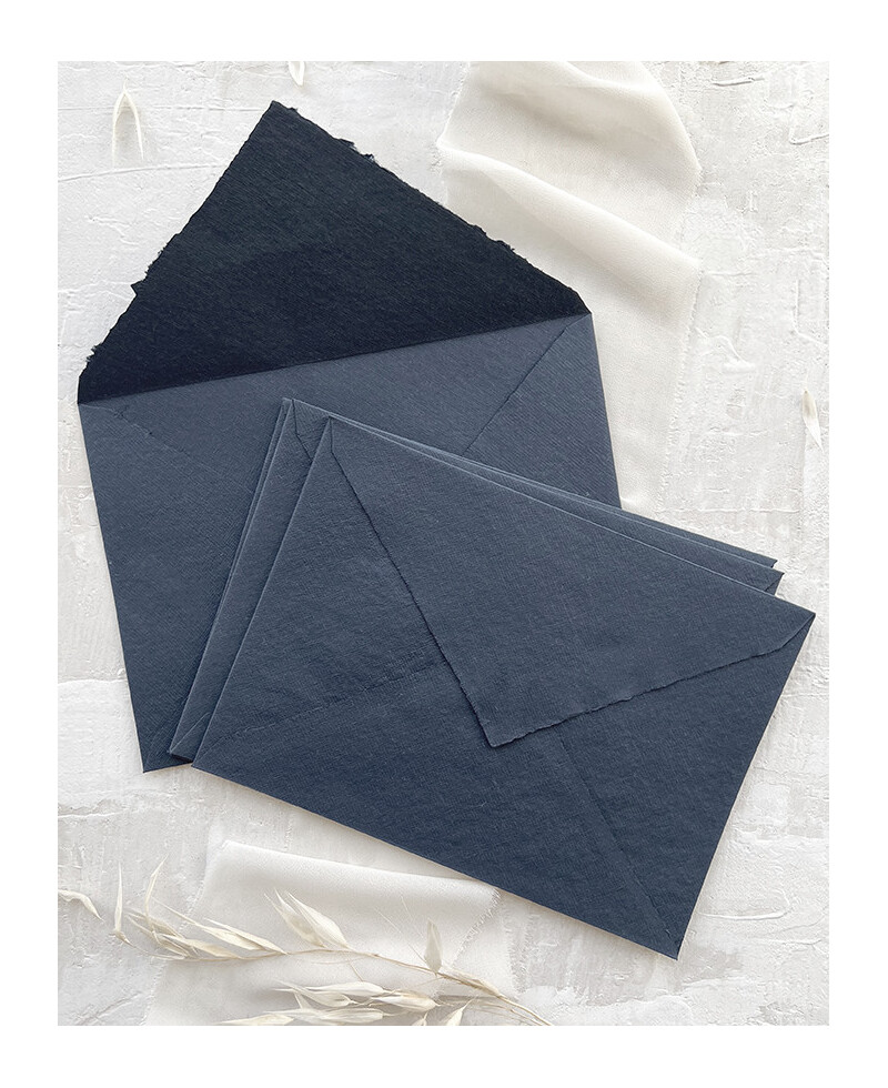La nostra gamma più esclusiva di buste fatte a mano, buste fatte a mano blu navy realizzate a mano con carte di altissima qualità (senza l'utilizzo di alberi) e peso (210 grammi!) realizzate artigianalmente senza acidi e tinte naturalmente. Il risultato sono buste uniche fatte a mano con un tocco deciso, strutturate, leggere ed eleganti con bordi strappati e barbe definite, molto eleganti.