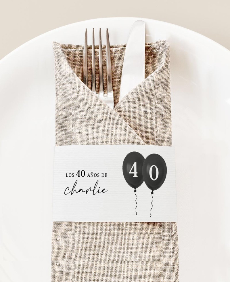 Portatovagliolo di compleanno personalizzato. Design tipografico minimalista con due palloncini decorativi. La decorazione della tavola perfetta per feste speciali.