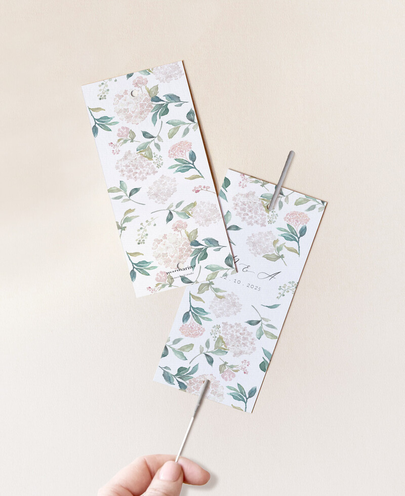 Porta svasato personalizzato per matrimonio. Decorato con una bellissima stampa floreale di ortensie rosa. Tra gli attributi di questo fiore ci sono la bellezza, l'abbondanza e la gratitudine. La cancelleria perfetta per la tua cerimonia nuziale a tema floreale.