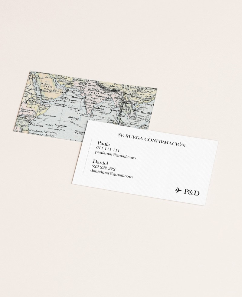 Scheda di confermaCartolina di conferma decorata con stampa della mappa del mondo vintage. Il complemento perfetto per i tuoi inviti di nozze a tema viaggio.