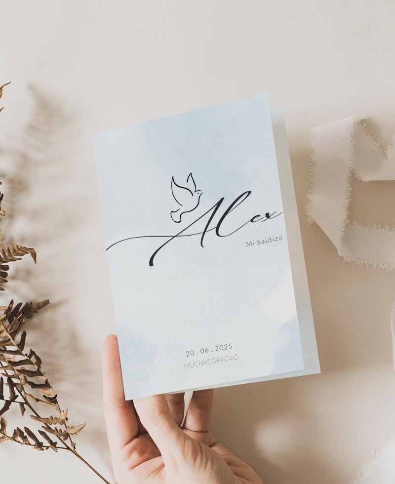 Lembrete de batismo em formato díptico. Gratidão infantil minimalista, com elegantes pinceladas de aquarela em tons de azul e uma pomba delicada em estilo clássico. Ideal para que seus entes queridos guardem um detalhe desse dia especial. Inclua uma foto de sua escolha!